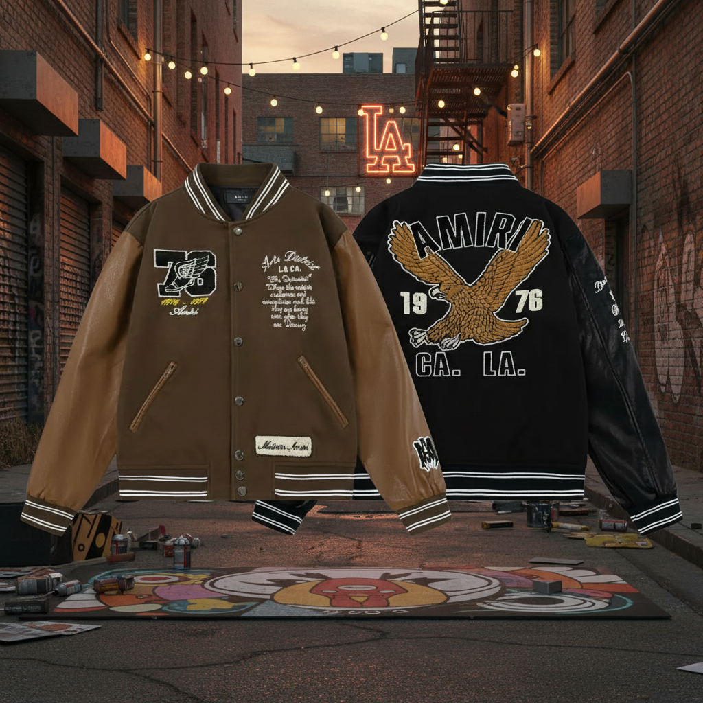 Amiri Eagle Varsity Jacket, stylish LA CA design, premium embroidery, leather sleeves, retro 1976 details, perfect streetwear for men seeking trendy and high-quality outerwear.