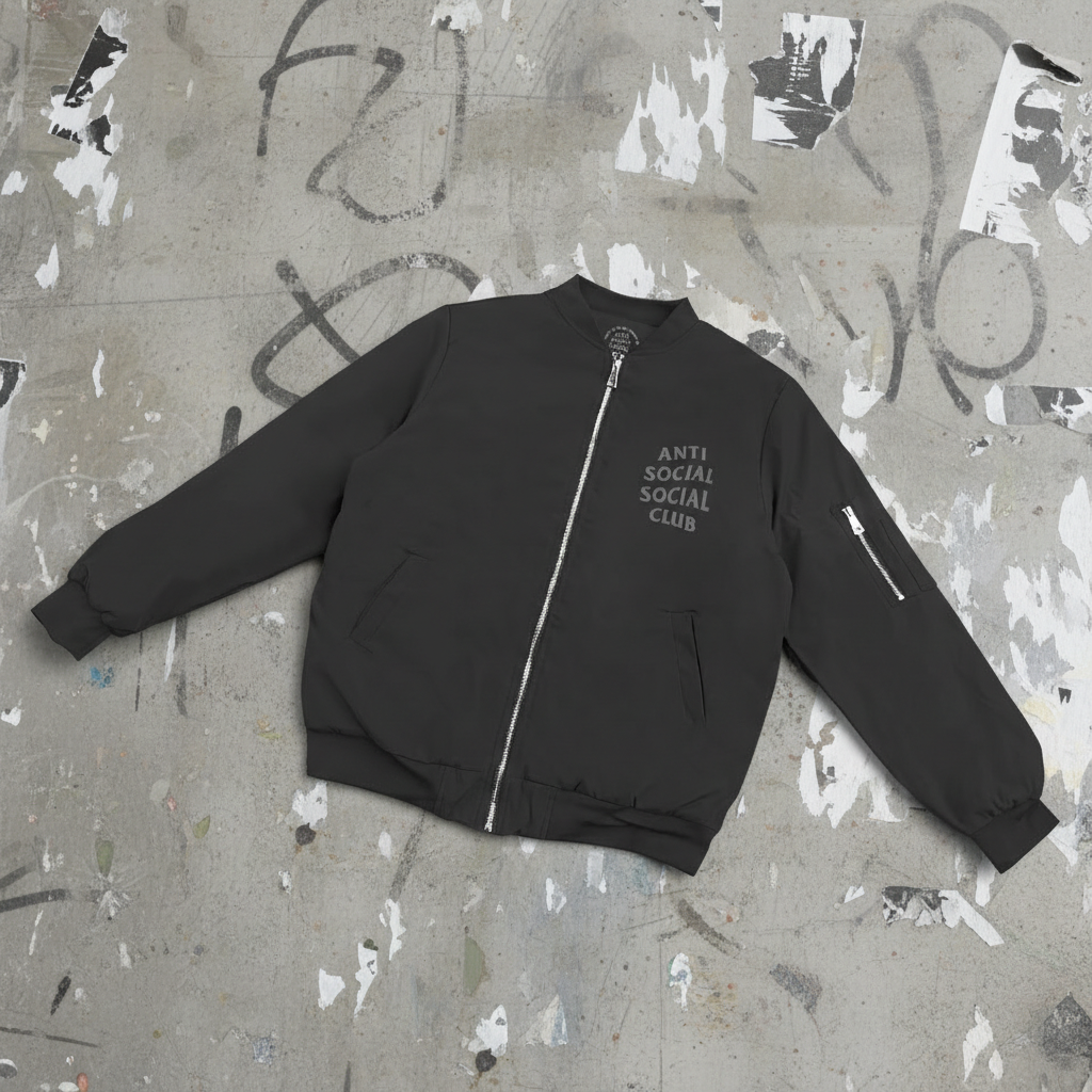 Anti Social Social Club black bomber jacket, stylish streetwear outerwear with front zipper, pocket details, and modern minimalist design for casual and urban fashion.