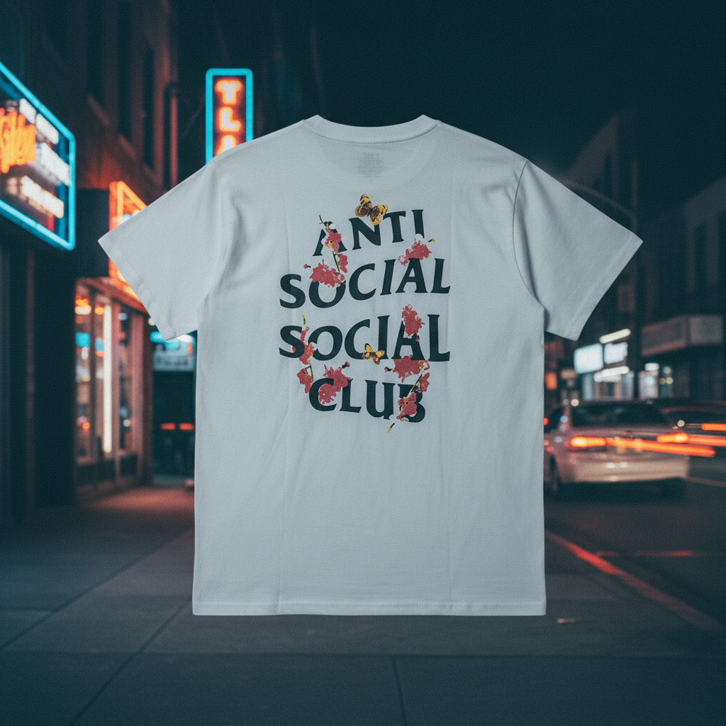 Anti Social Social Club T-Shirt featuring floral and butterfly graphic, premium cotton fabric, casual streetwear style, perfect for daily wear and fashion lovers.