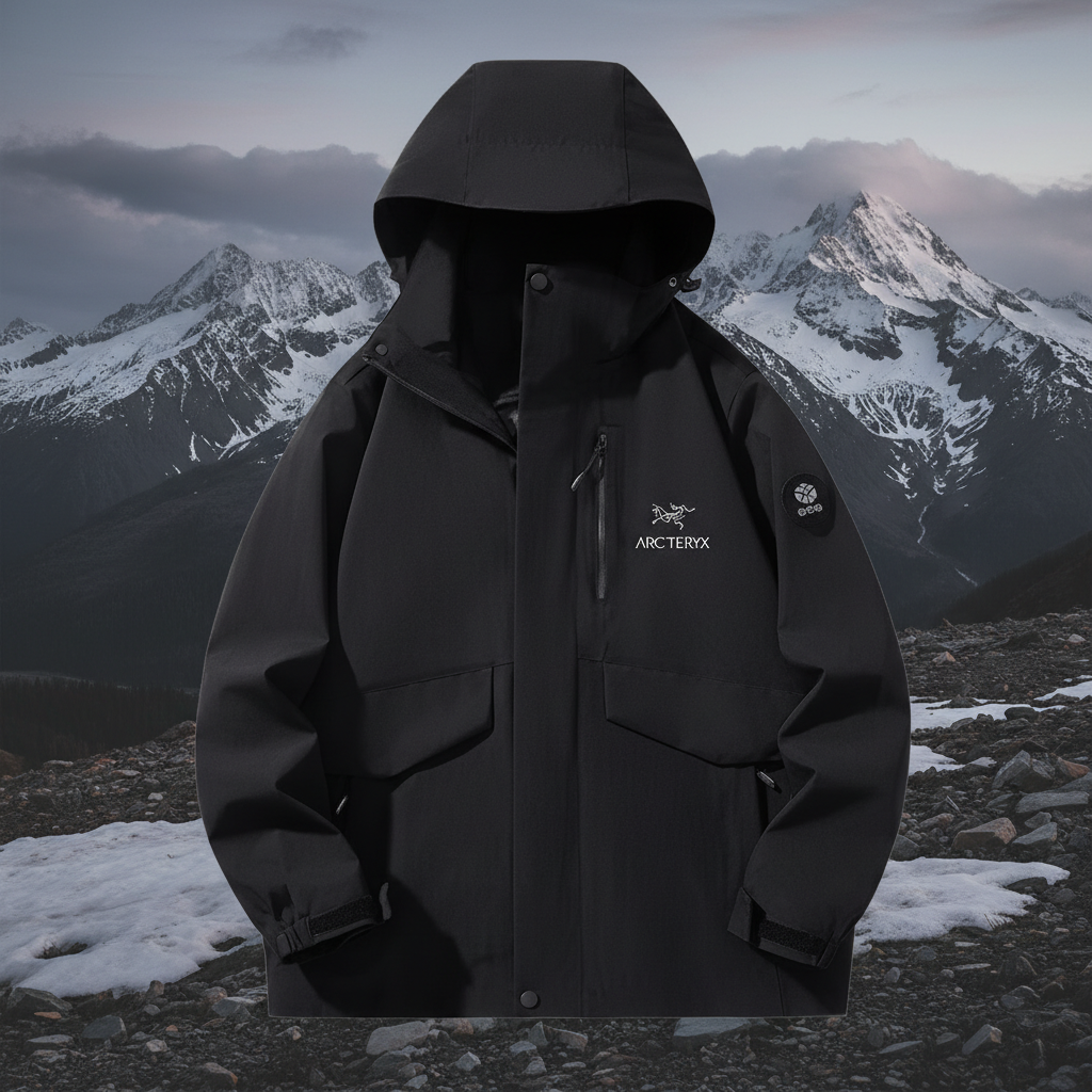 Arc’teryx Men’s Waterproof Outdoor Jacket, Windproof Hooded Coat for Hiking, Camping and Winter Sports, Durable Black Shell with Stylish Design.