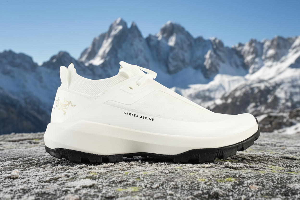 Arc’teryx Vertex Alpine white trail running shoes, lightweight breathable design, durable grip sole, perfect for hiking, trekking, and outdoor adventures, sizes 39-45.
