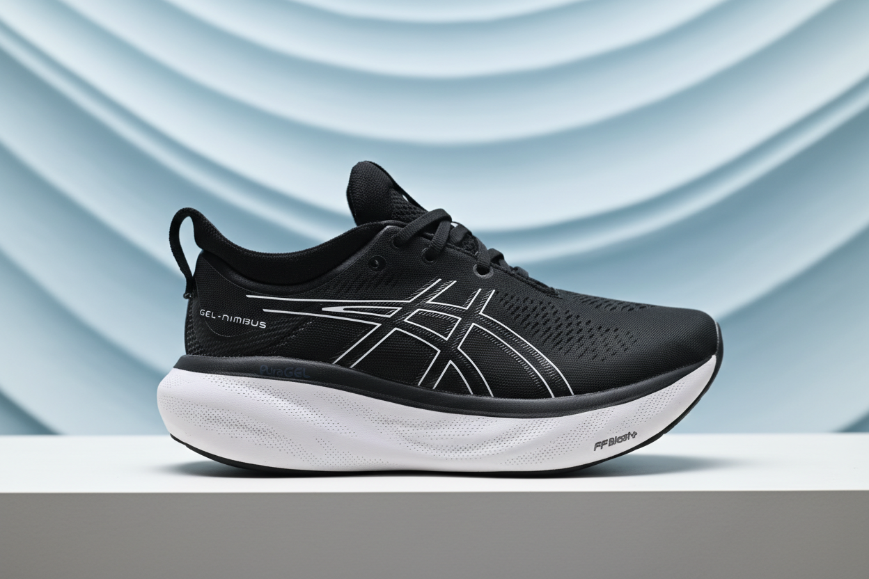 ASICS GEL-Nimbus running shoes with PureGEL cushioning and breathable mesh upper, offering comfort, support, and durability for daily runs and long-distance training.