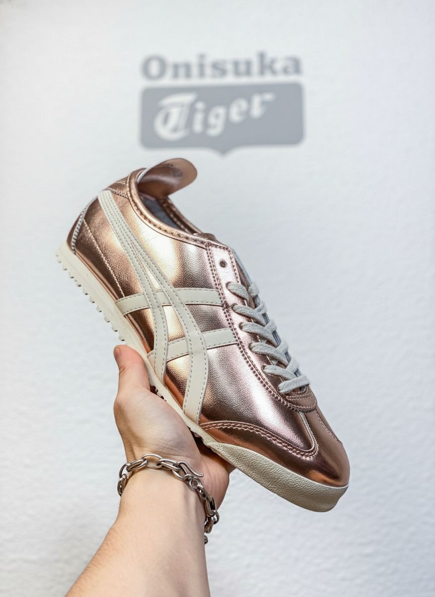 Asics Metallic Rose Gold Sneakers, classic low-top design with white stripes, durable sole, stylish and comfortable for everyday wear, available sizes 36-45.