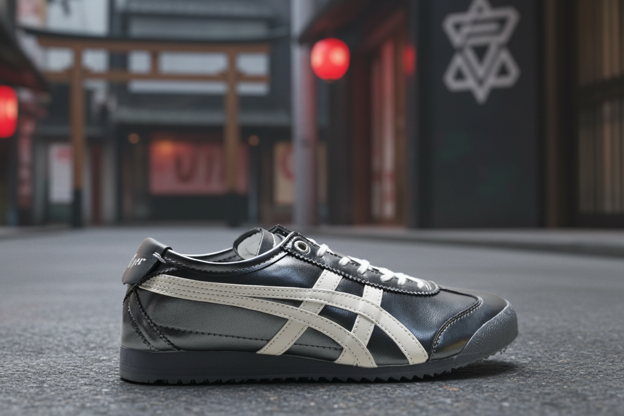 Asics Onitsuka Tiger Mexico 66 Black White Sneakers, classic low-top design, premium leather, comfortable fit, ideal for casual wear and street style.
