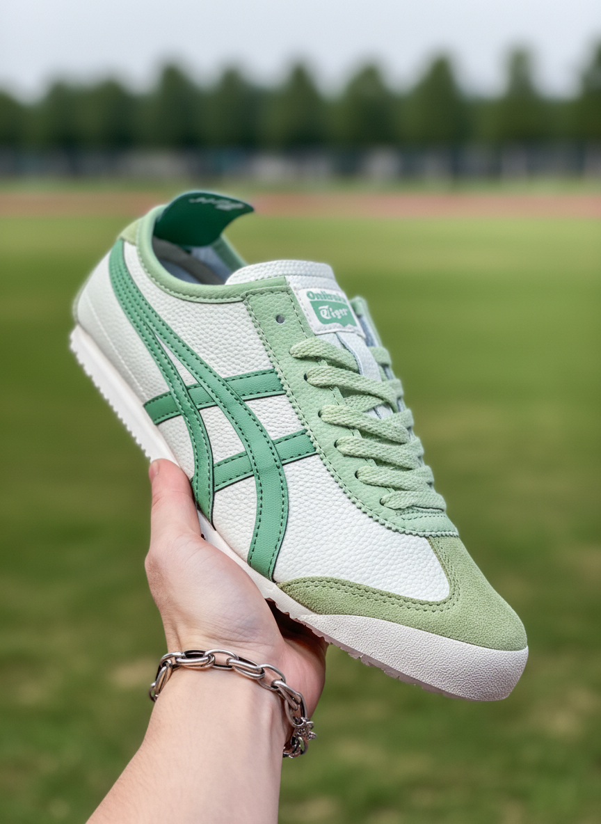 ASICS Onitsuka Tiger green white sneakers, classic retro style, premium leather and suede, comfortable fit, sizes 36-45.