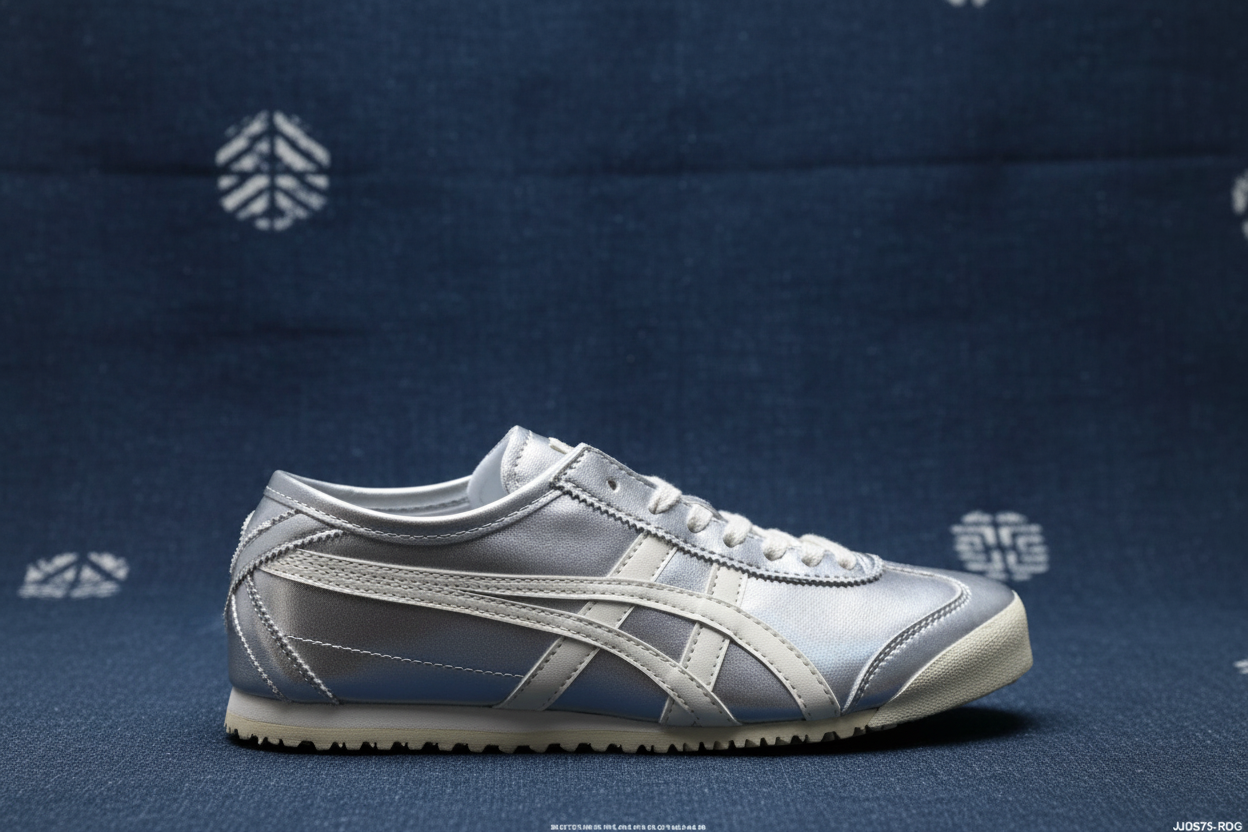 ASICS metallic silver casual sneakers with classic white stripes, lightweight design, durable sole, perfect for everyday wear and stylish street fashion.