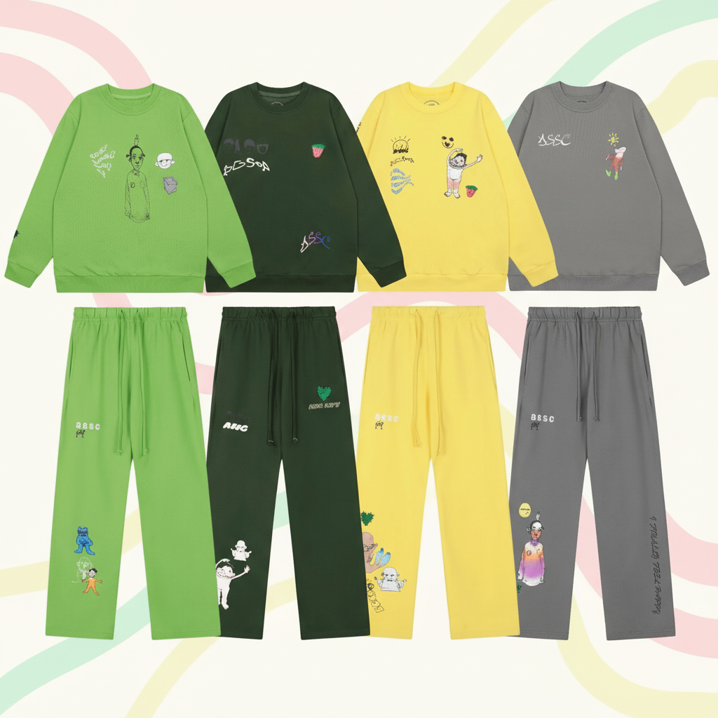 ASSC Hoodies and Sweatpants Set, colorful cartoon prints, soft cotton, casual streetwear style for men and women, perfect for layering and everyday comfort.
