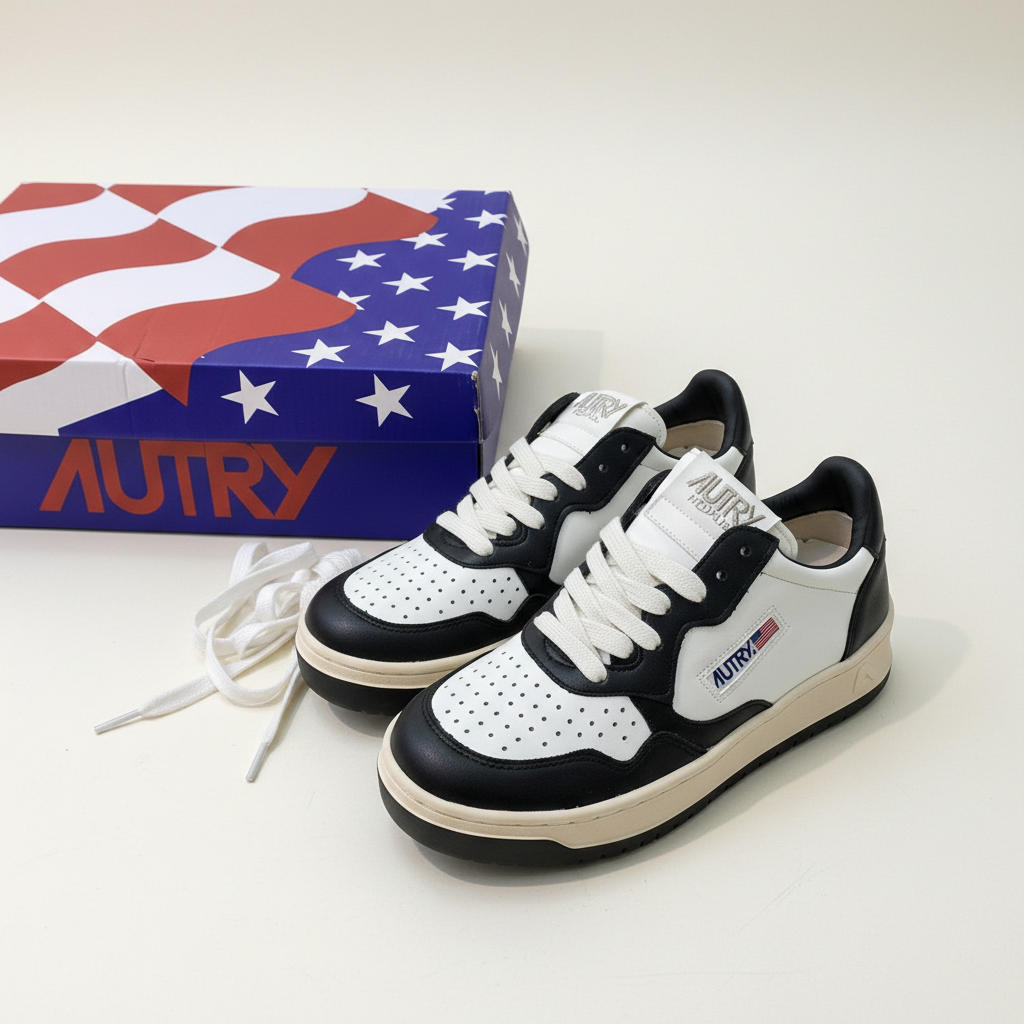 Autry sneakers, classic black and white leather, retro sporty design, breathable comfort, perfect for casual wear and street style.