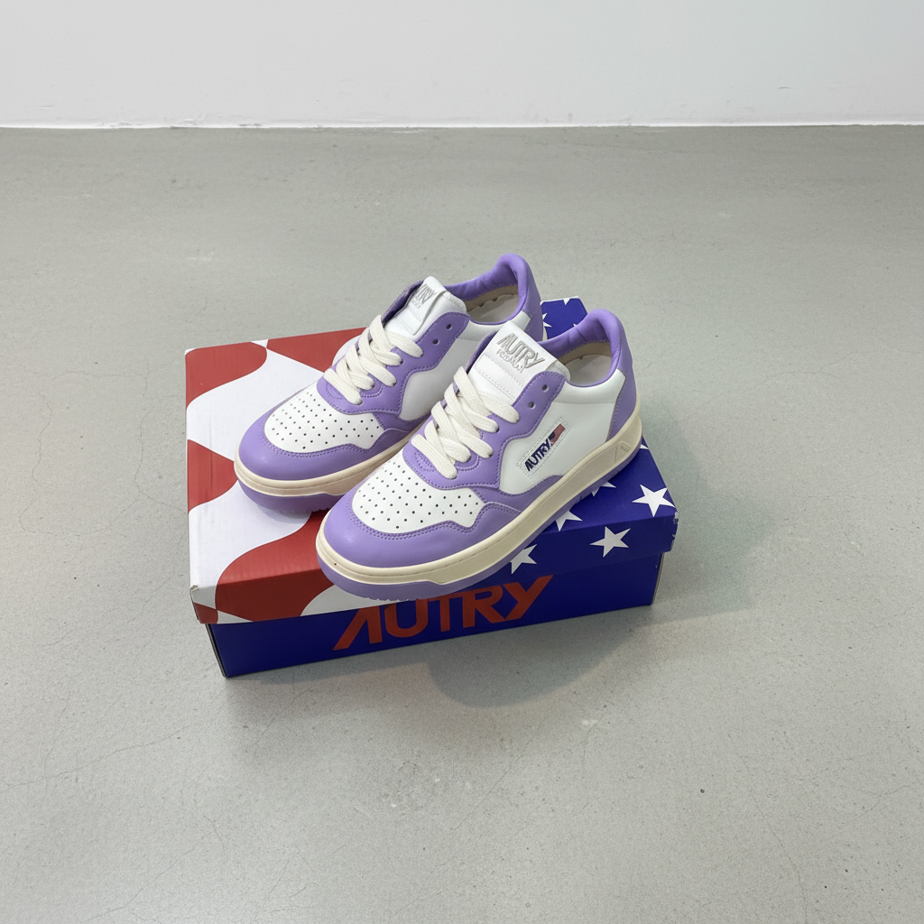 Autry sneakers in white and purple leather, retro-inspired design with perforated details, cushioned sole for comfort, perfect for casual and sporty everyday wear.