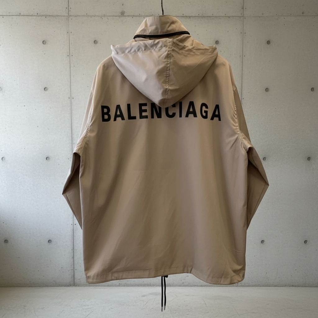 Balenciaga Men’s Beige Hooded Windbreaker Jacket, Lightweight Outerwear with Bold Back Logo, Stylish and Comfortable for Spring and Fall.