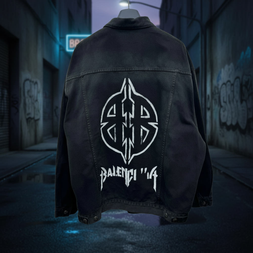 Balenciaga black denim jacket with bold graphic logo print on back, streetwear style, casual oversized fit for trendy fashion lovers.