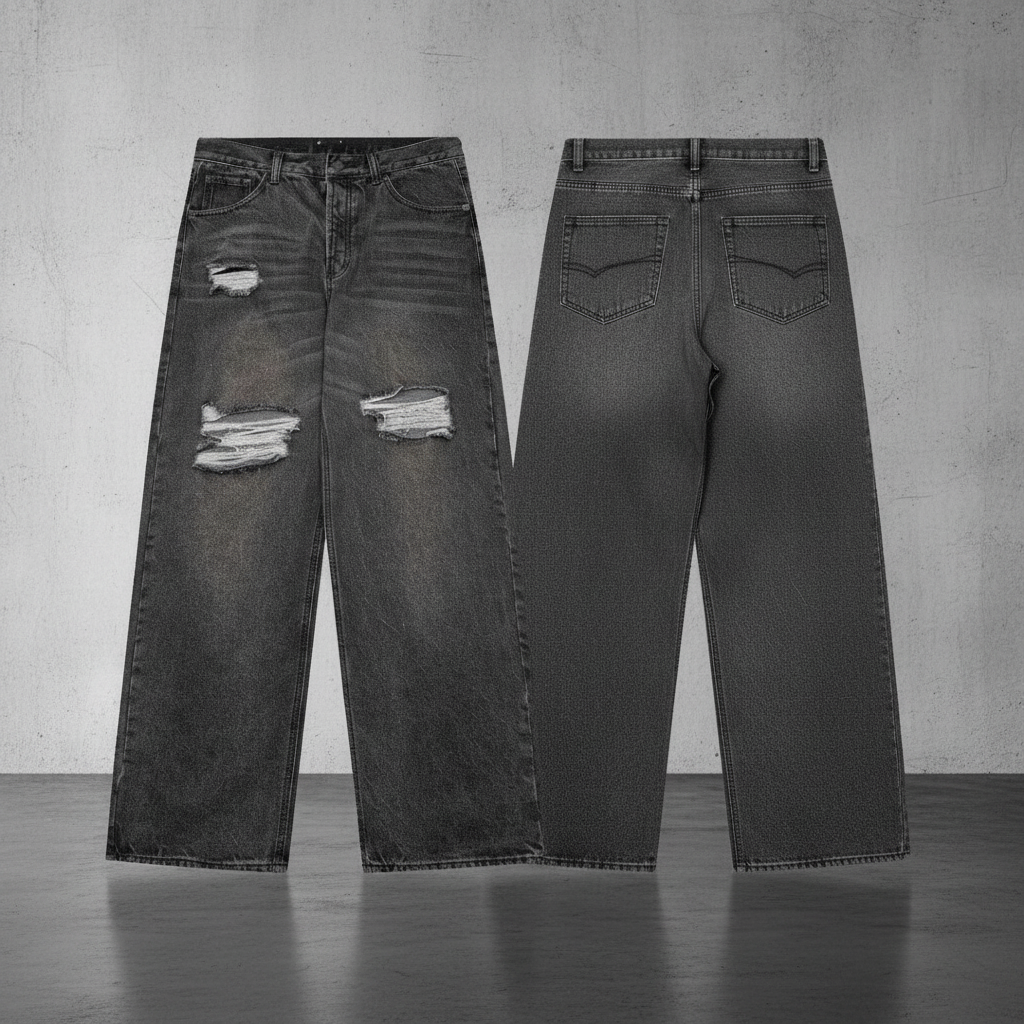 Balenciaga distressed wide-leg black jeans with ripped details, vintage washed denim, casual streetwear style for men and women.