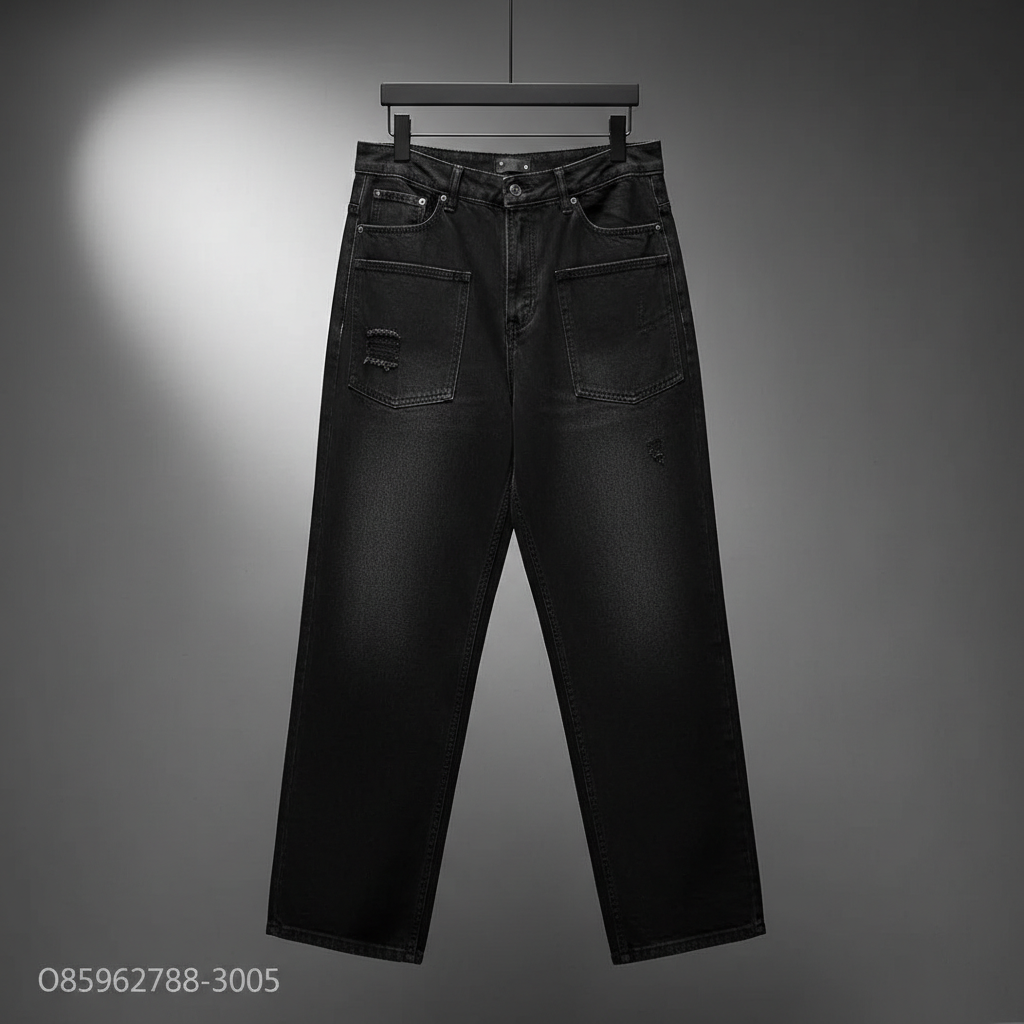 Balenciaga black distressed wide-leg jeans with front patch pockets, premium denim for casual streetwear style.