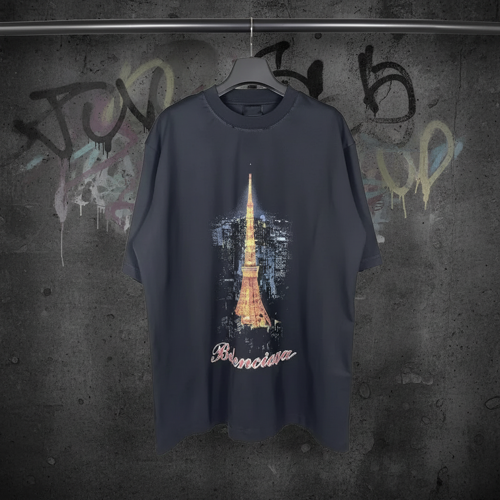 Balenciaga black graphic T-shirt featuring illuminated tower print, premium cotton, casual streetwear style, perfect for trendy urban fashion looks.