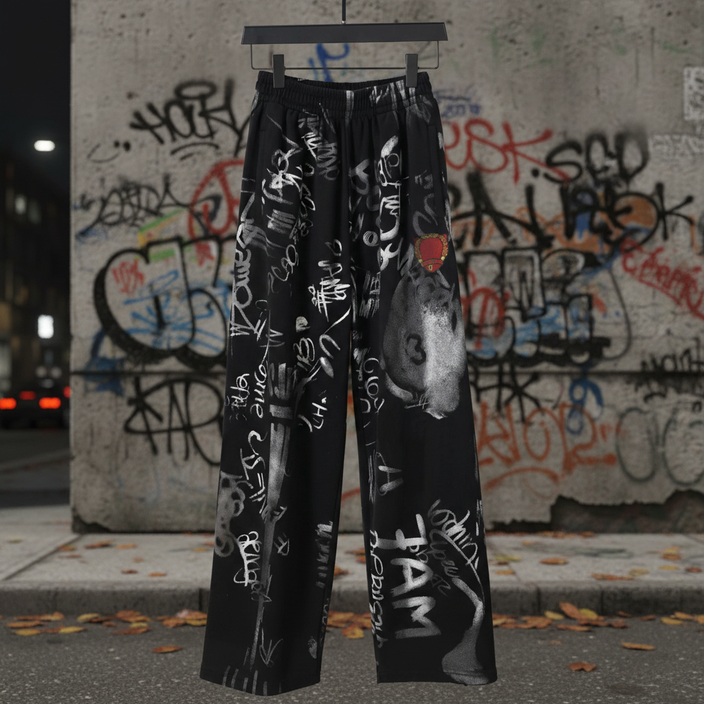 Balenciaga Men’s Black Graffiti Print Pants, Streetwear Loose Fit Trousers with Elastic Waist, Trendy Hip Hop Style for Casual and Urban Outfits