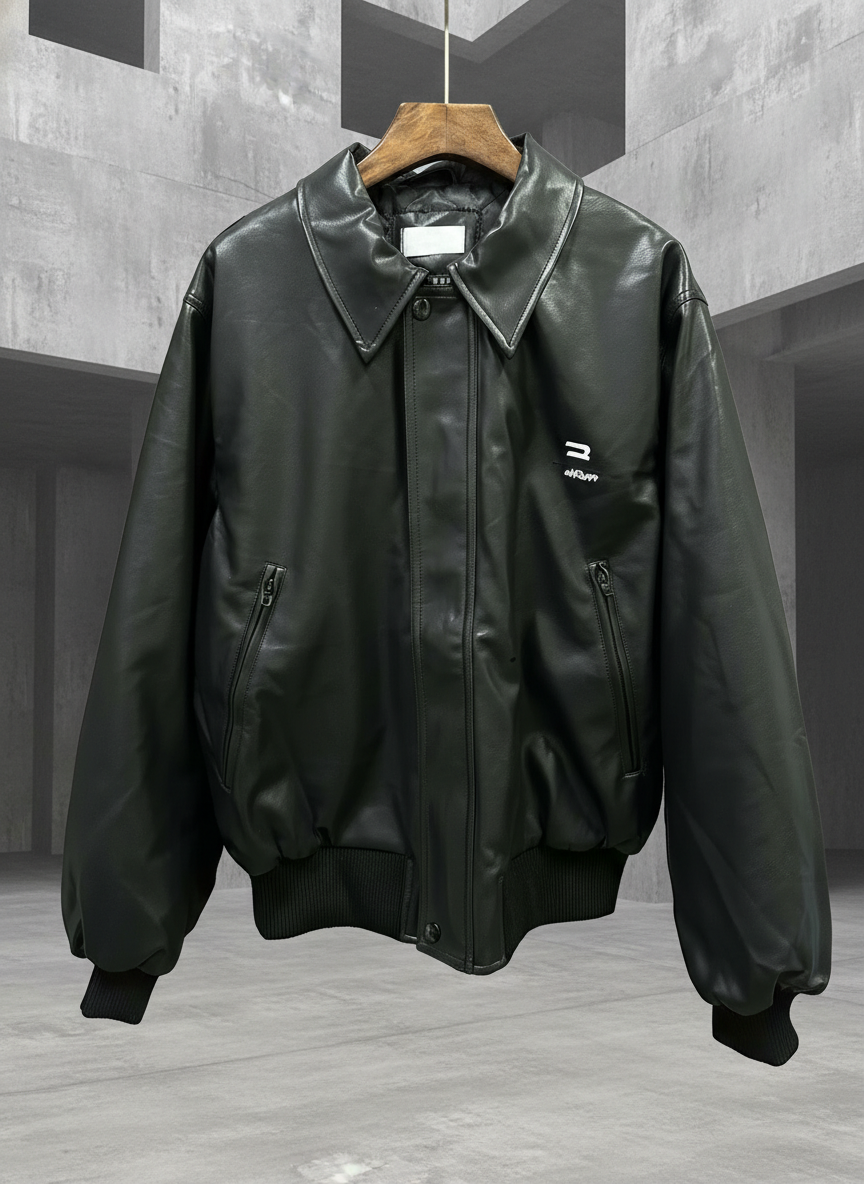 Balenciaga Men’s Black Leather Jacket with Zip Pockets, Classic Collar, and Ribbed Hem for Stylish Comfort and Modern Streetwear Appeal.