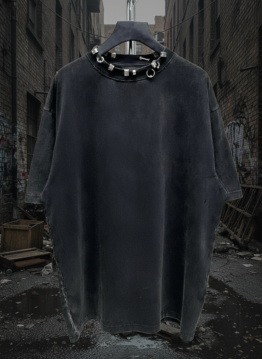Balenciaga black oversized T-shirt with metal ring neckline, streetwear style, premium cotton, trendy casual fashion for men and women.