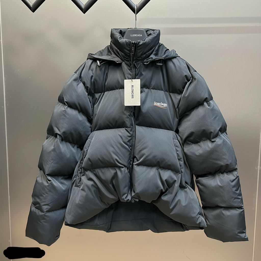 Balenciaga puffer jacket, warm and stylish winter coat with high collar, premium insulation, and modern oversized fit for ultimate comfort and fashion.