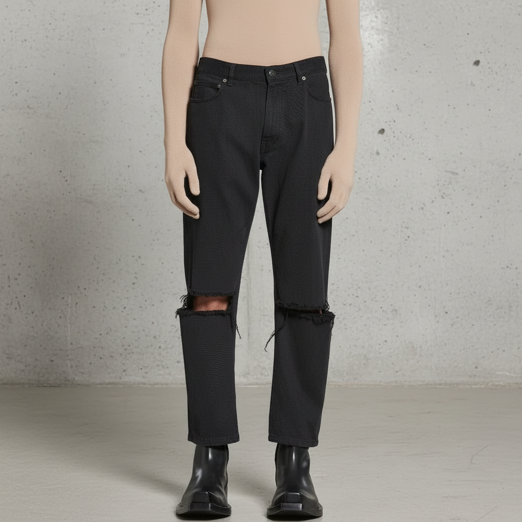 Balenciaga Men’s Distressed Black Jeans with Knee Rips, Stylish Slim Fit Denim Pants for Streetwear and Casual Outfits