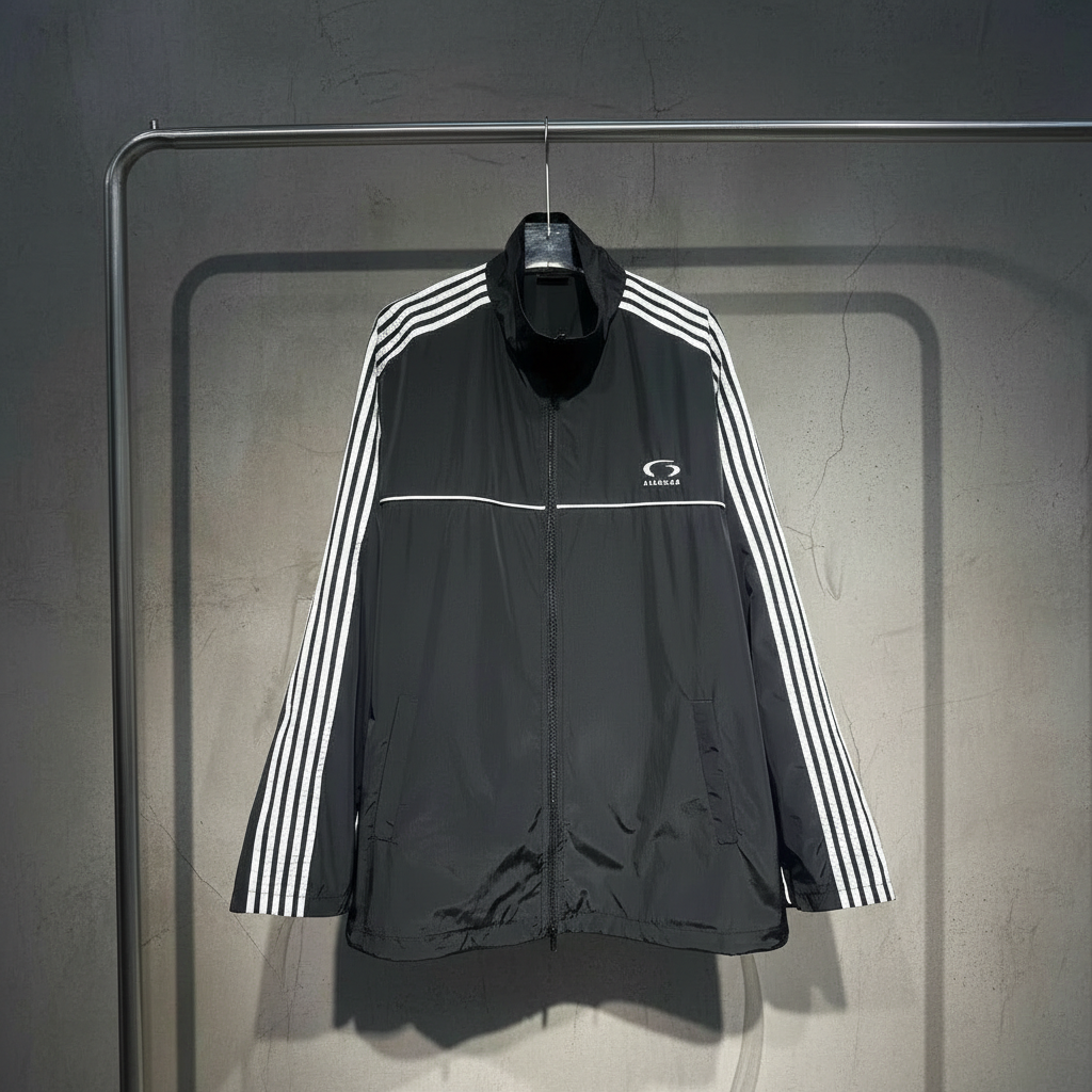 Balenciaga Men’s Black Track Jacket with White Stripes, Lightweight Sportswear, Full Zip, High Collar, Streetwear Style