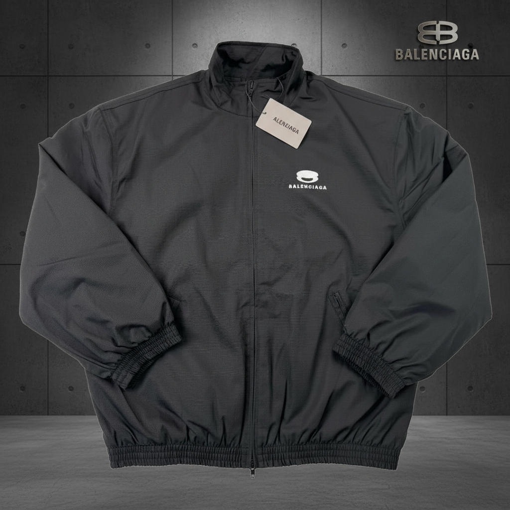 Balenciaga Men’s Black Zip-Up Jacket, Lightweight Windbreaker with Logo, Stylish Streetwear Outerwear for All Seasons
