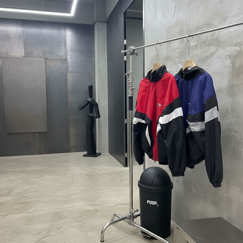 Balenciaga color-block windbreaker jacket, lightweight sporty design, unisex streetwear style, perfect for casual or outdoor activities.