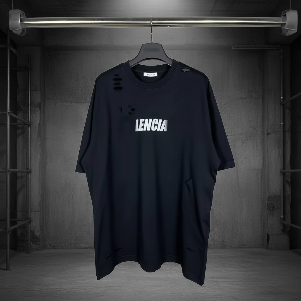 Balenciaga distressed black cotton T-shirt with bold logo print, oversized fit, and streetwear style, perfect for casual and trendy fashion lovers.