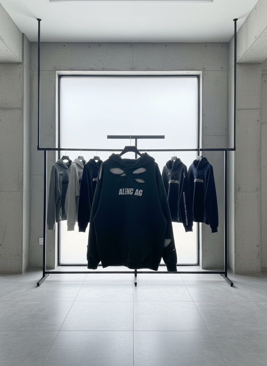 Balenciaga distressed oversized hoodie, trendy ripped design, soft cotton comfort, streetwear style, perfect for casual and fashion-forward looks.