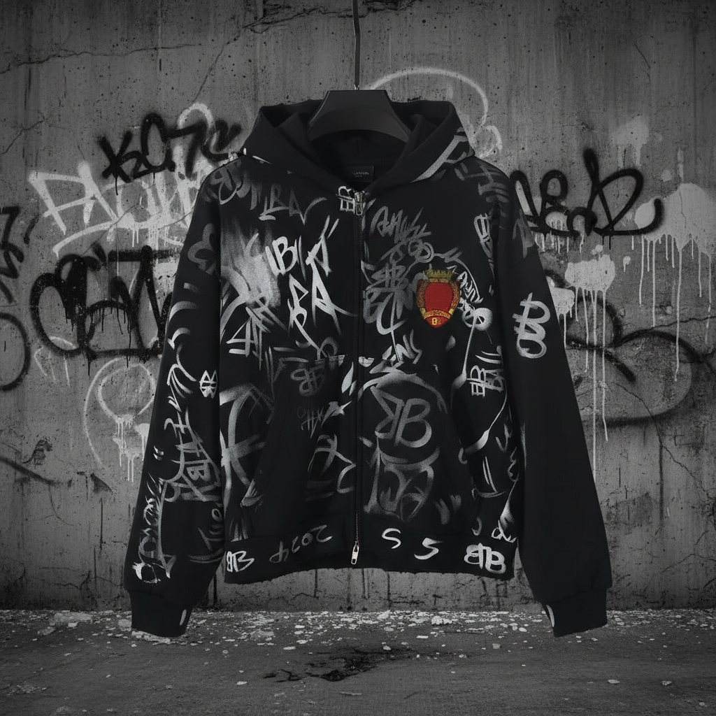 Balenciaga Graffiti Print Black Hoodie, Streetwear Zip Up Sweatshirt with Hood and Front Pockets, Fashion Casual Pullover for Men and Women