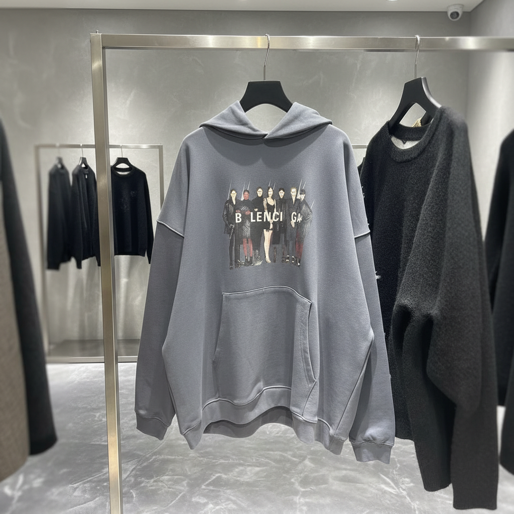 Balenciaga oversized grey hoodie with front graphic print, premium cotton, streetwear style, unisex casual fashion sweatshirt for autumn and winter.