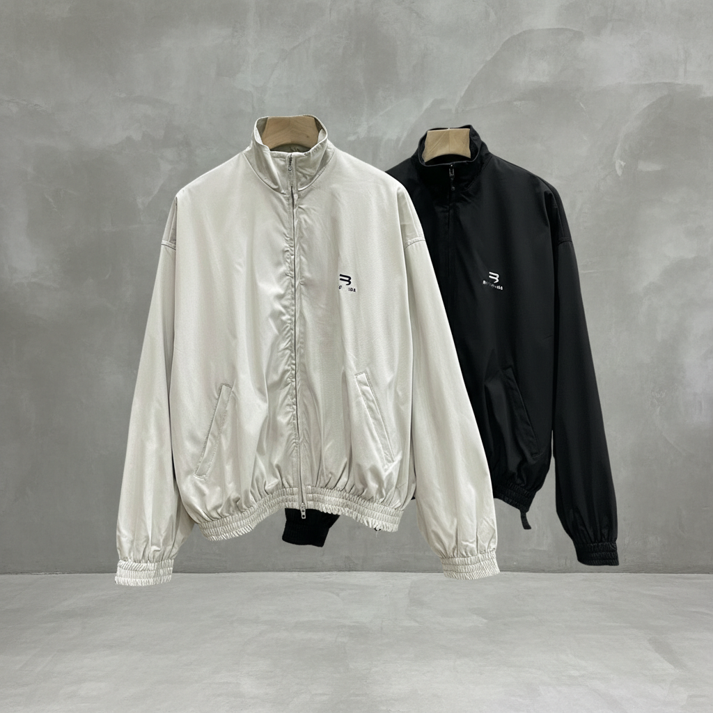 Balenciaga lightweight zip-up jackets for men, casual fashion windbreaker with high collar, stylish black and white design, perfect for streetwear and everyday wear.