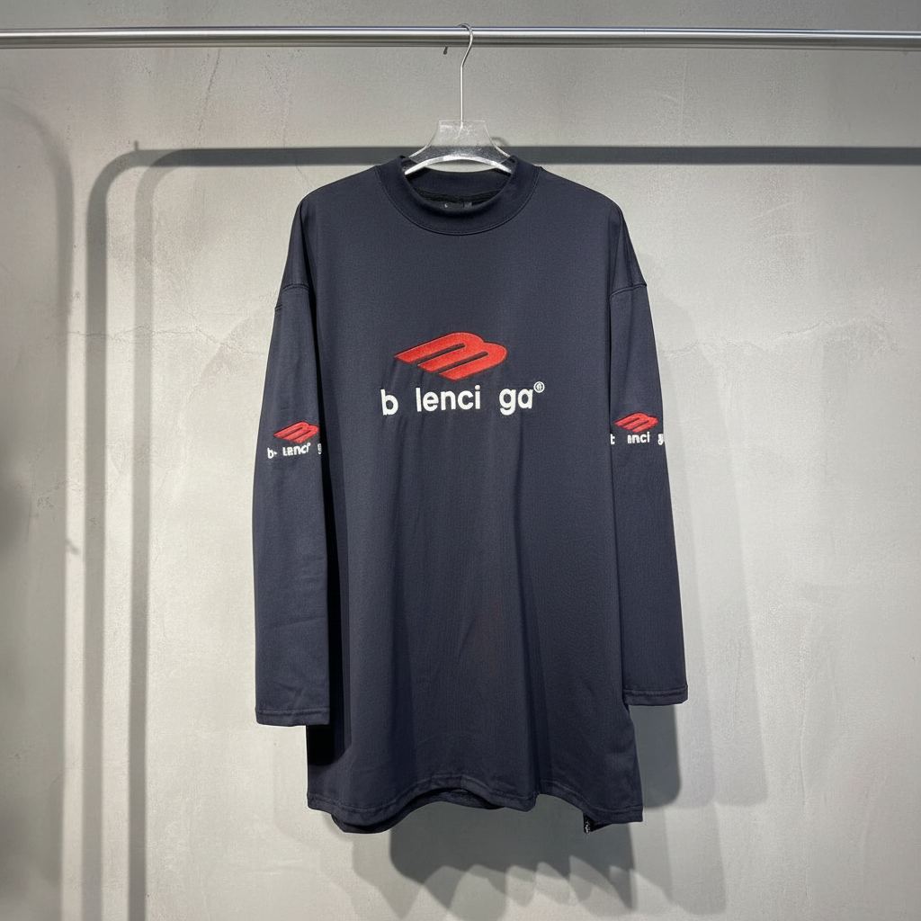 Balenciaga long sleeve black t-shirt with bold red logo print, premium cotton, streetwear style, perfect for casual and fashion-forward looks.