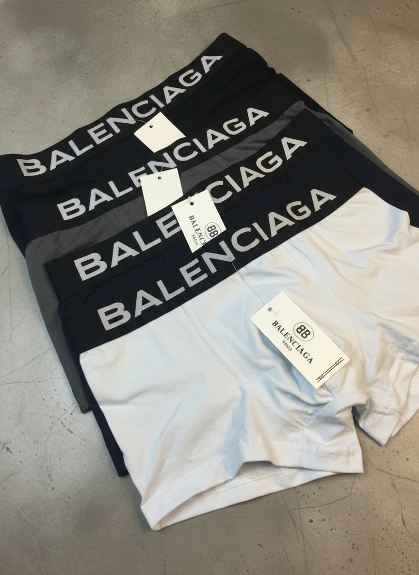 Balenciaga men’s boxer briefs 4-pack, premium cotton, elastic logo waistband, breathable comfort, stylish fit for everyday wear.