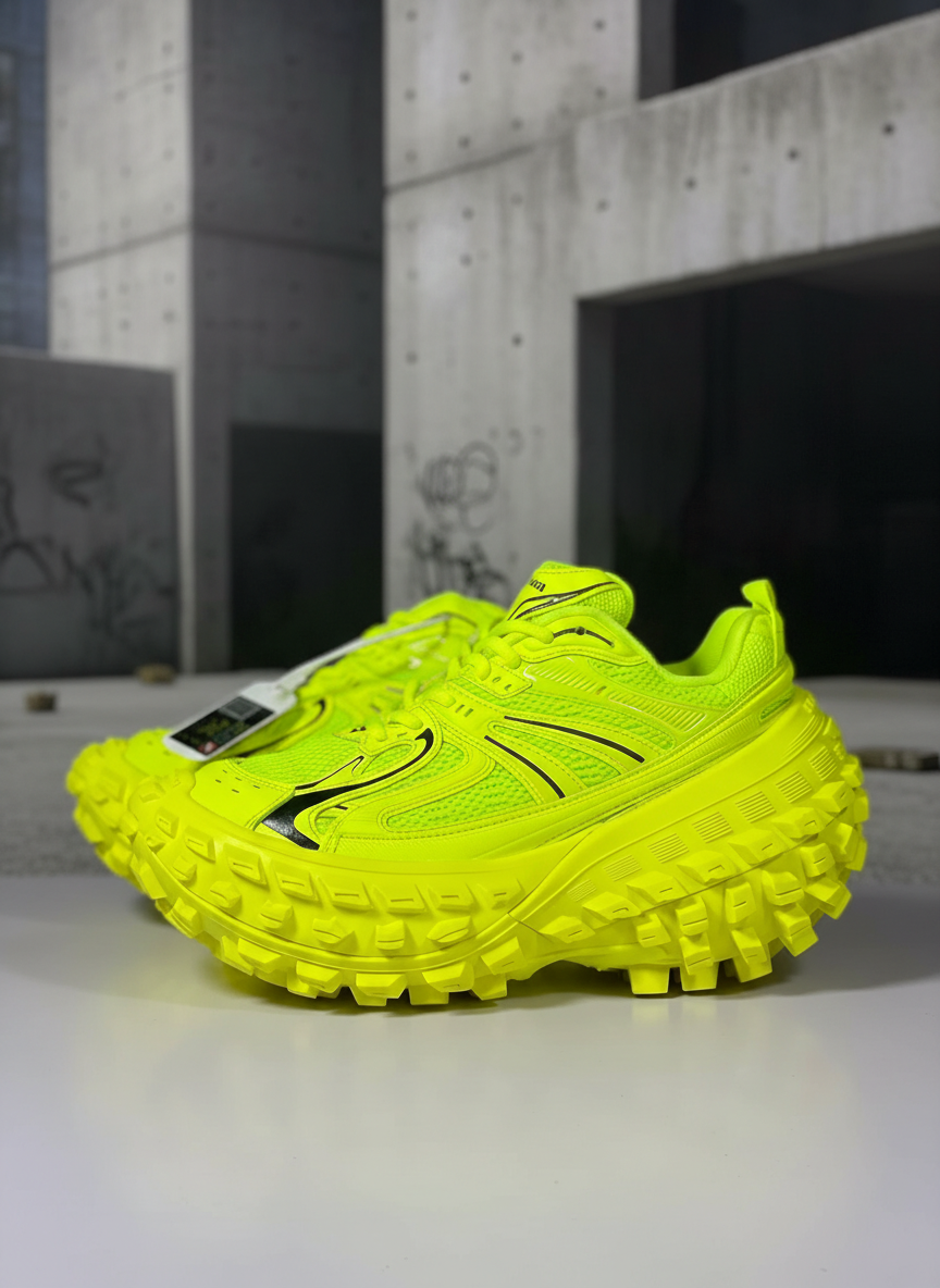 Balenciaga Neon Yellow Chunky Sneakers, bold futuristic design with textured sole, breathable mesh upper, perfect for streetwear and high-fashion sneaker lovers.