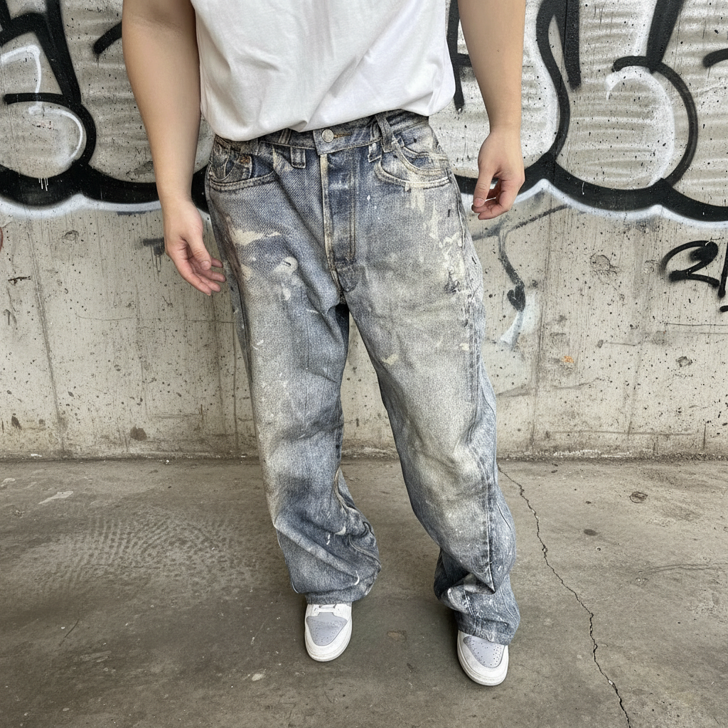 Balenciaga distressed wide-leg jeans with paint splatter design, vintage washed denim, casual streetwear style for men and women.