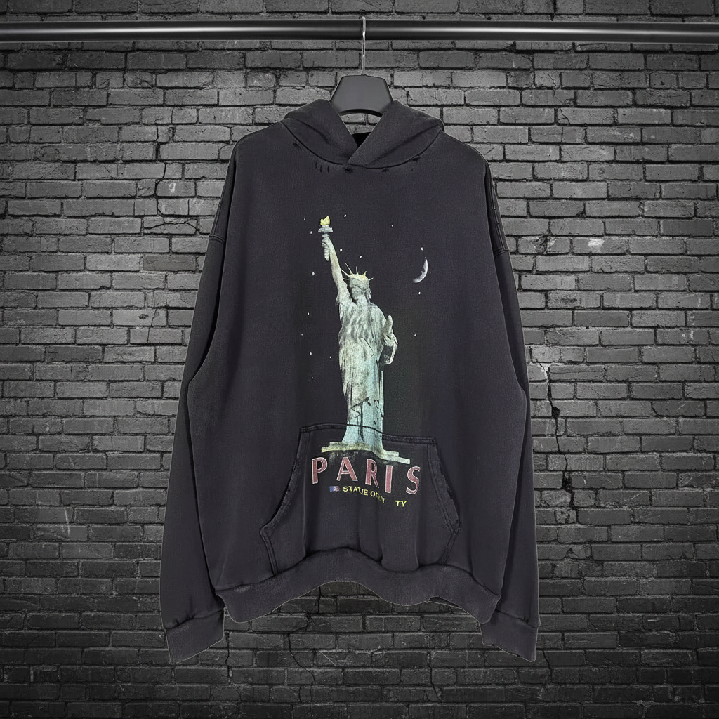 Balenciaga Paris Statue of Liberty graphic black hoodie, casual oversized streetwear, soft cotton pullover for men and women.