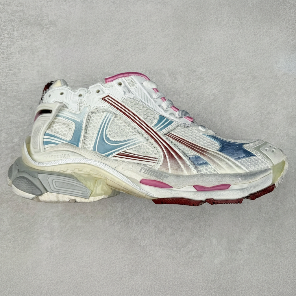Balenciaga white mesh sneakers with red, blue, and pink accents, chunky sole design, stylish lightweight trainers for men and women.