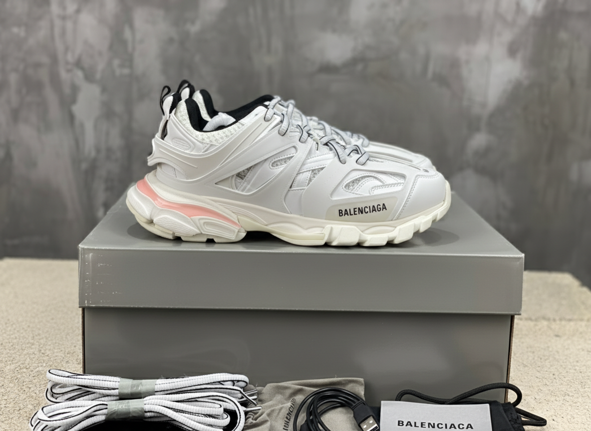 Balenciaga Track Sneakers White Pink, luxury designer running shoes with breathable mesh, layered panels, and cushioned sole for stylish comfort.