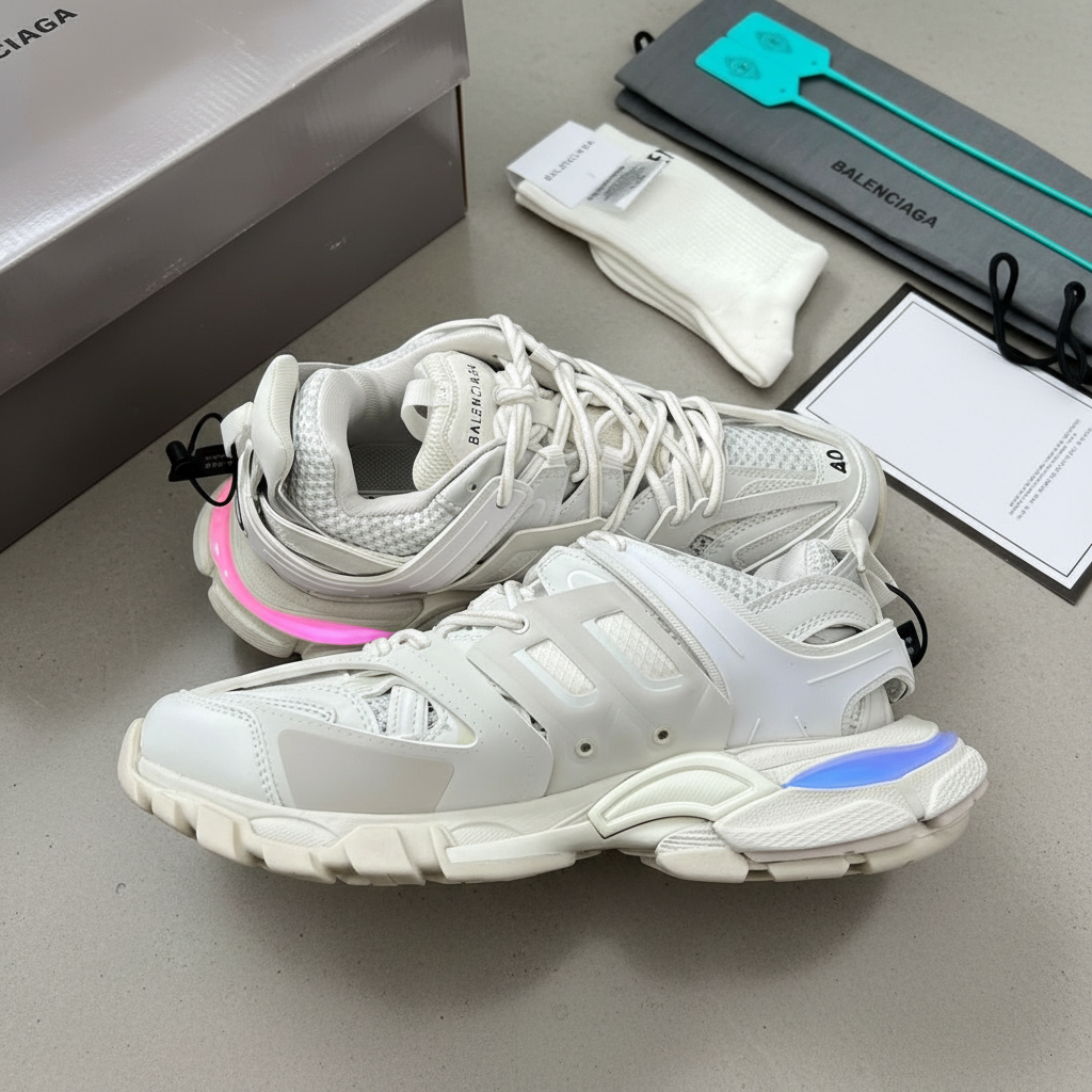 Balenciaga white mesh and leather sneakers with chunky sole, neon heel accents, and sporty design, perfect for streetwear and luxury fashion style.