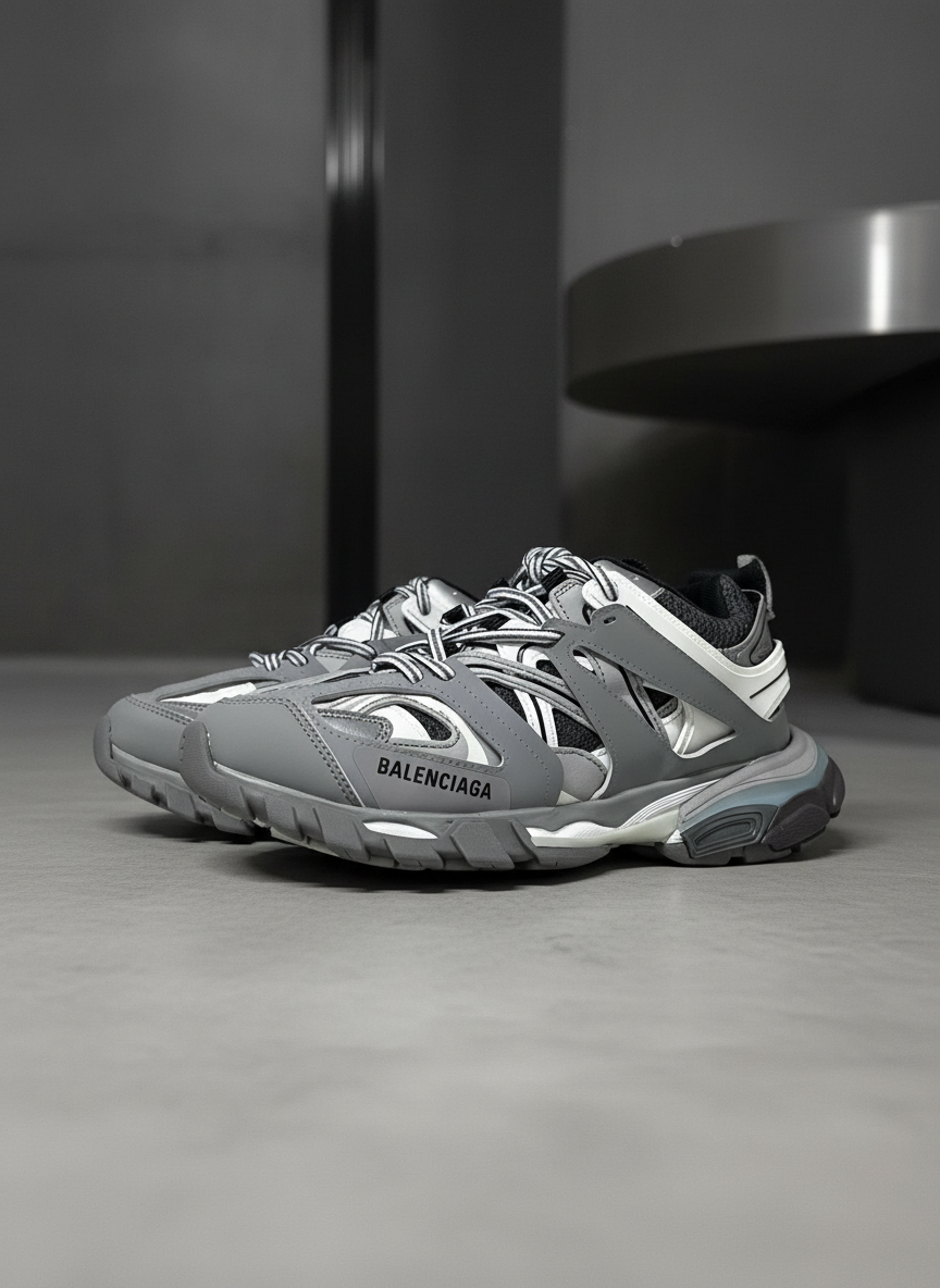 Balenciaga Track Sneakers Grey White Mesh Leather, Stylish Chunky Design, Comfort Cushion Sole, Trendy Sports Luxury Footwear for Men and Women