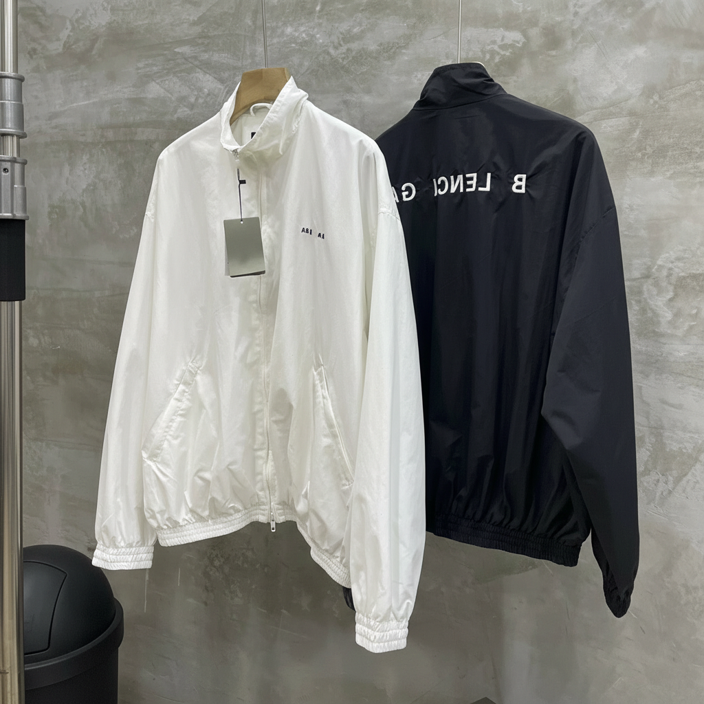Balenciaga lightweight zip-up jackets, stylish windbreaker design, available in classic black and white, perfect for casual streetwear and all-season fashion.