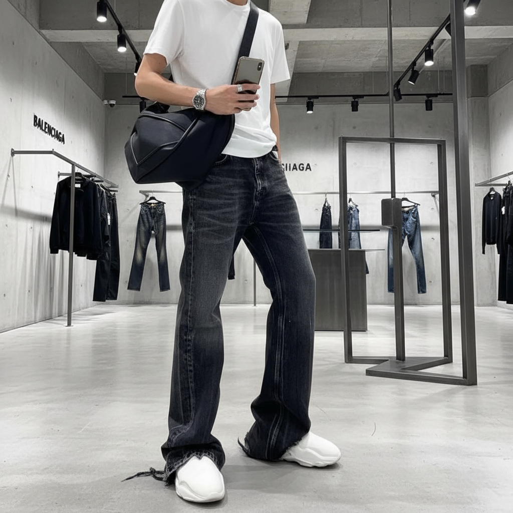 Balenciaga distressed wide-leg jeans, vintage washed black denim, casual streetwear style, unisex fashion, premium quality trousers for everyday wear.
