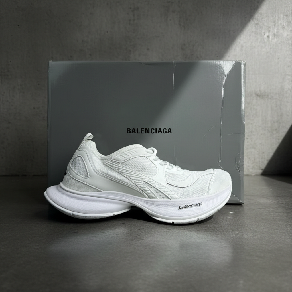 Balenciaga White Mesh Leather Sneakers, stylish chunky sole trainers for men and women, luxury fashion running shoes with breathable design and premium comfort.
