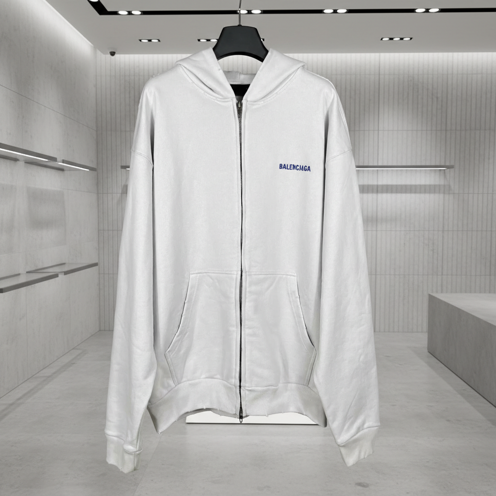 Balenciaga White Zip-Up Hoodie, premium cotton, minimalist design with front pockets, casual streetwear style for men and women.