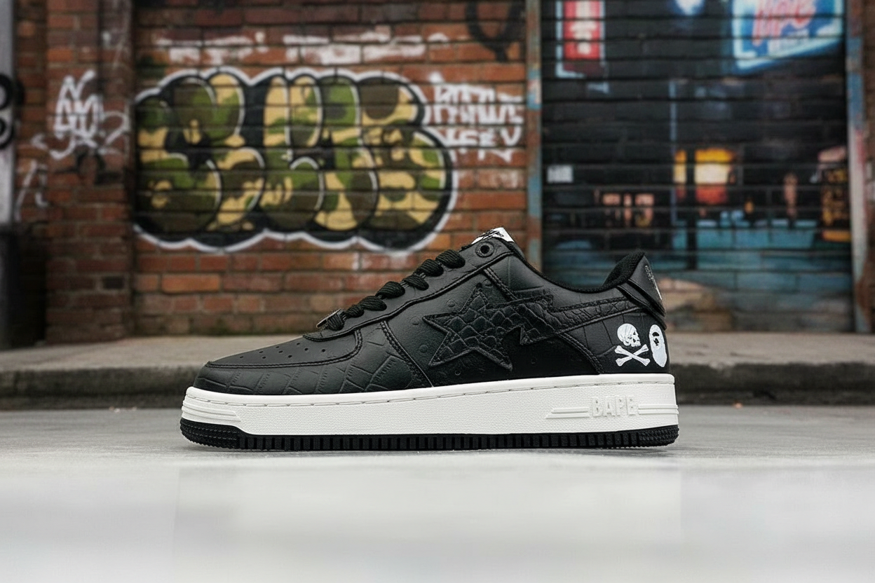 BAPE Black Croc Leather Sneakers with Skull Print, Premium Streetwear Shoes, Comfort Fit, Durable Sole, Trendy Design for Men and Women