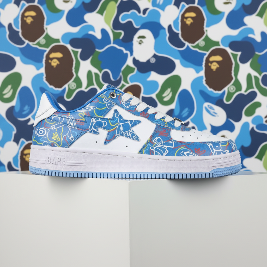 BAPE Blue Graphic Low-Top Sneakers with iconic star logo, premium leather, vibrant street art design, and durable sole for ultimate urban style and comfort.