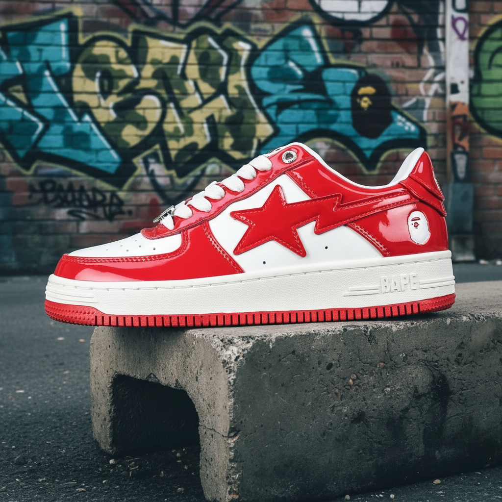 BAPE Red White Low Top Sneakers with iconic star logo, patent leather finish, durable rubber sole, and streetwear style for everyday fashion and comfort.