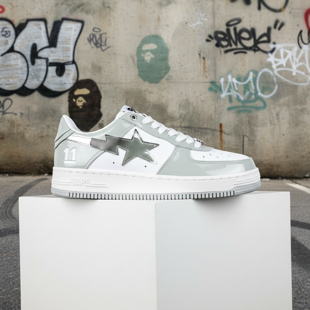 BAPE stylish grey and white low-top sneakers with signature star logo, camo accents, and durable rubber sole for streetwear fashion and everyday comfort.