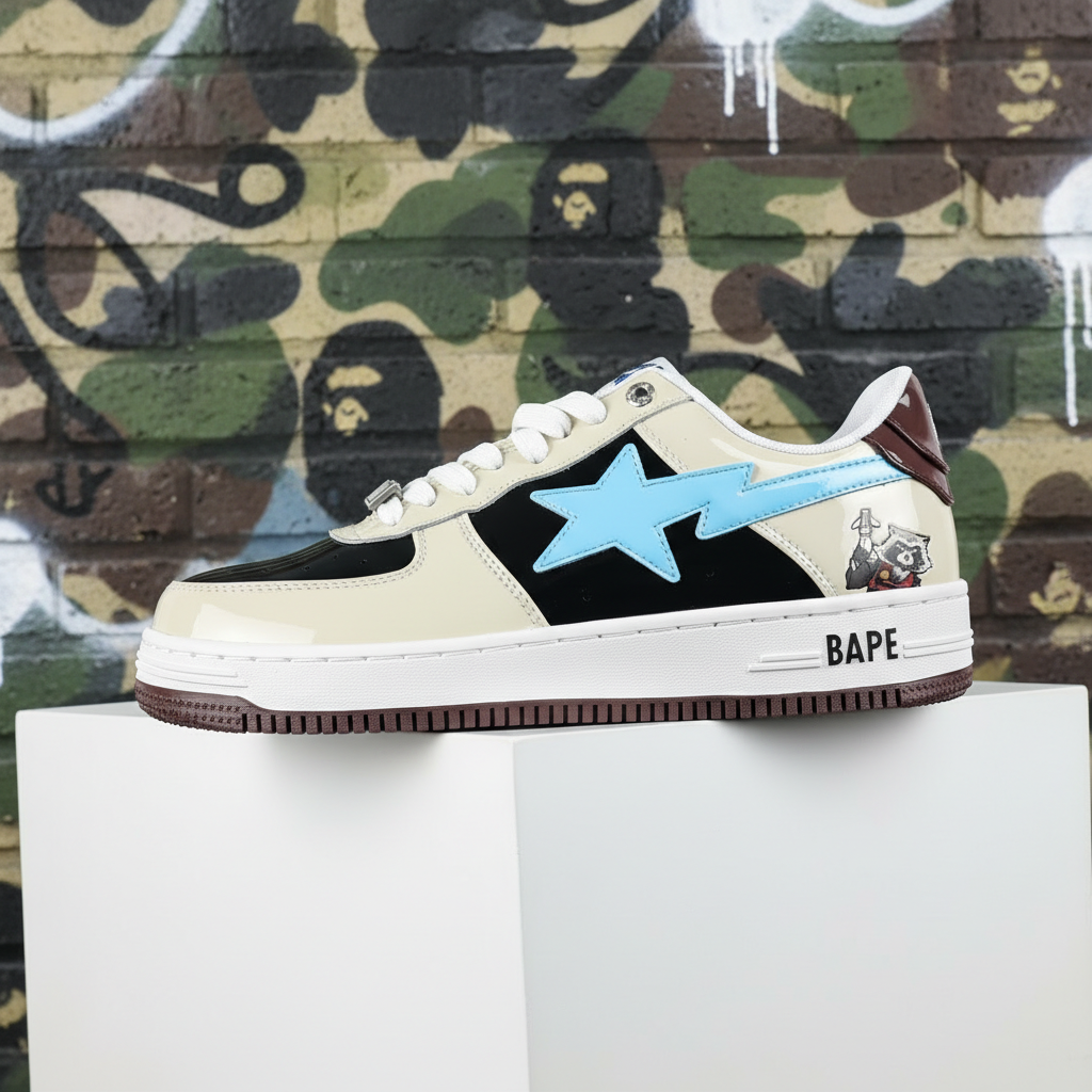 BAPE low-top sneakers with blue star logo, cream and black panels, cartoon detail, and durable sole for streetwear style and comfort.