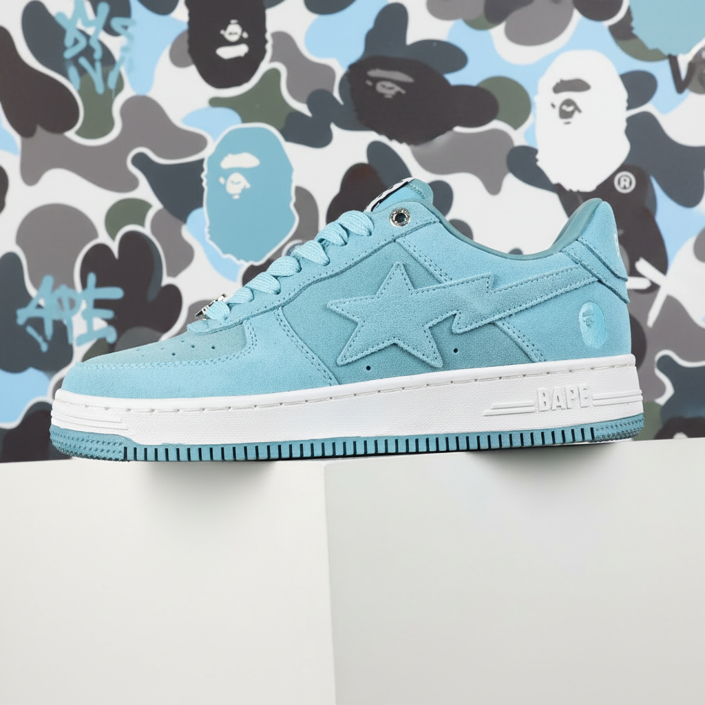 BAPE Blue Suede Low-Top Sneakers feature signature star logo, durable rubber sole, and premium comfort for streetwear style and everyday wear.